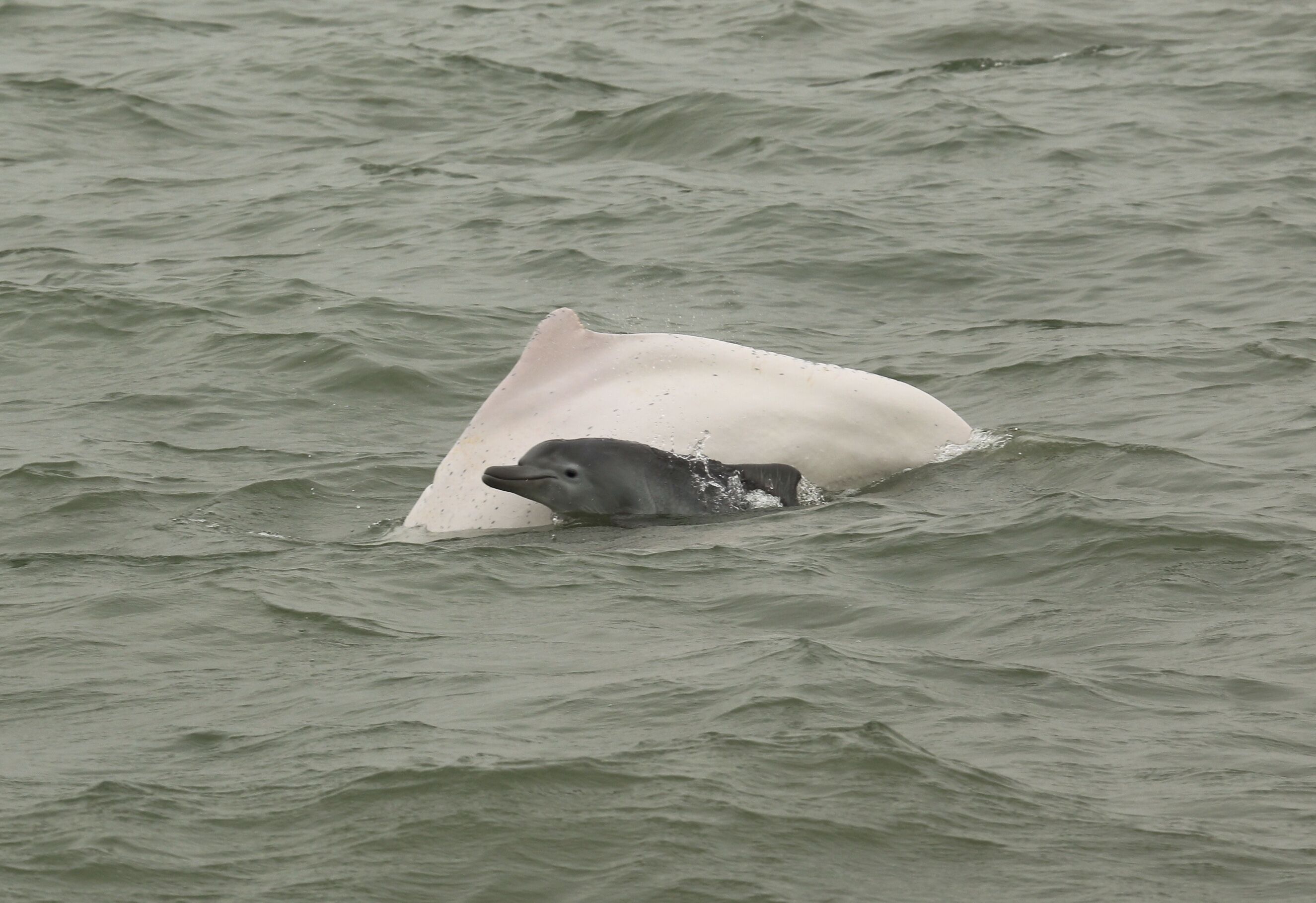 科研人员认出,这只中华白海豚妈妈是厦门保护区的主人之一“大白”,海豚宝宝看起来刚出生没多久。据介绍,中华白海豚的平均寿命为30~40岁,已经30多岁的“大白”实属“高龄妈妈”。上一次“大白”生宝宝还是2012年。