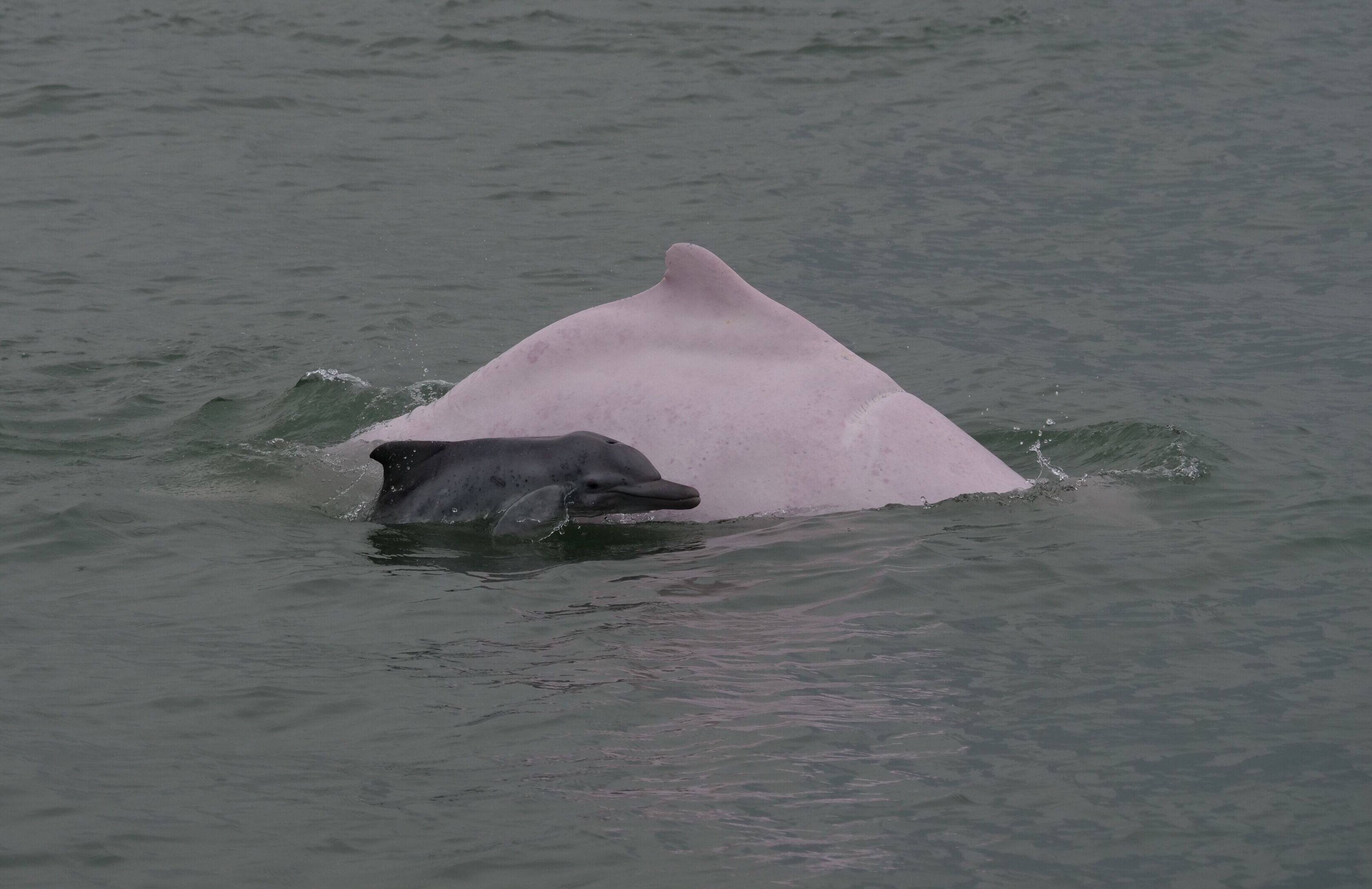 近日,在厦门珍稀海洋物种国家级自然保护区,自然资源部第三海洋研究所科研队拍到了罕见亲子画面:一只通体粉色的中华白海豚妈妈带着皮肤黝黑的海豚宝宝在大海中畅游。小海豚紧挨着海豚妈妈,时而跃出水面,时而潜入水下,母子俩行动一致,十分温馨。这也是科研人员今年首次在厦门海域拍到中华白海豚幼崽。