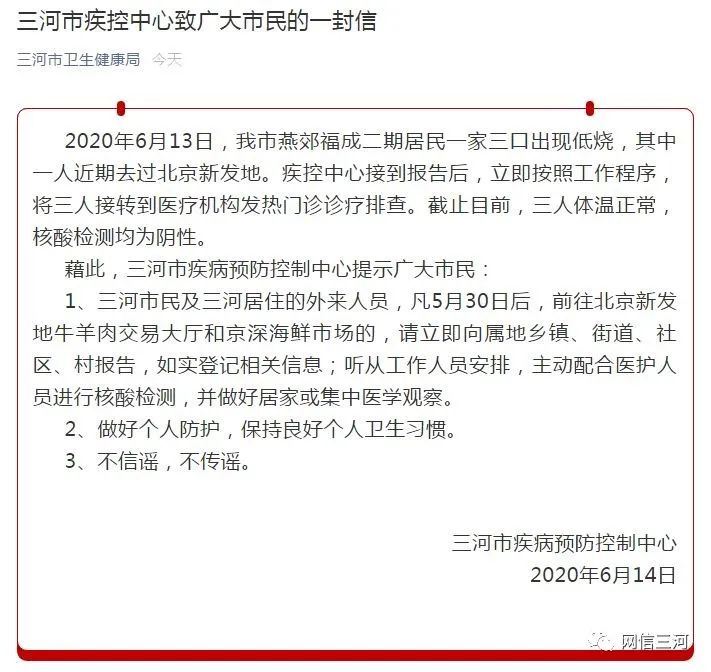 2020年6月13日,网传“河北省三河市市燕郊福成二期居民一家三口出现低烧,其中一人近期去过北京新发地”,引起社会关注。对此,三河市疾控中心接到报告后,立即按照工作程序,将三人接转到医疗机构发热门诊诊疗排查。三河市疾控中心最新回应:截止目前,三人体温正常,核酸检测均为阴性。