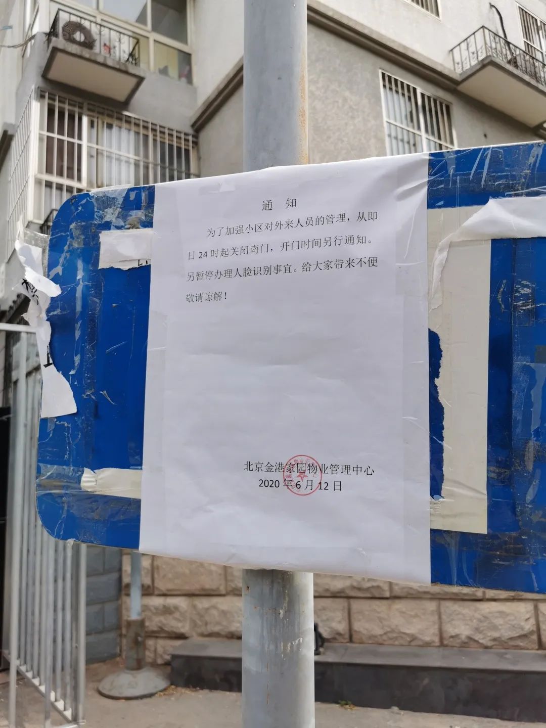 整个小区非常安静,不时还能听到阵阵鸟鸣。宜兰园一区南门也拉着铁栅栏,大门前张贴着“通知”:“为加强小区对外来人员的管理,从即日24时起关闭南门,开门时间另行通知。”通知落款是“北京金港家园物业管理中心”,发出时间为:“2020年6月12日”。这正是小区进入全封闭的时间。