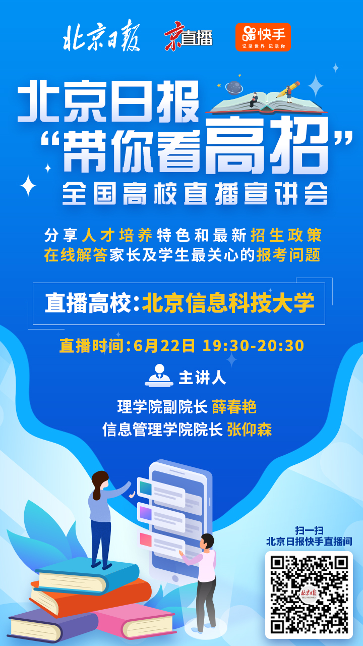届时,两位老师还将与网友互动,为网友们答疑解惑。6月22日19:30—20:30,带上您对今年高校招生的疑惑,来北京日报快手直播间与北京信息科技大学的老师们互动交流吧!