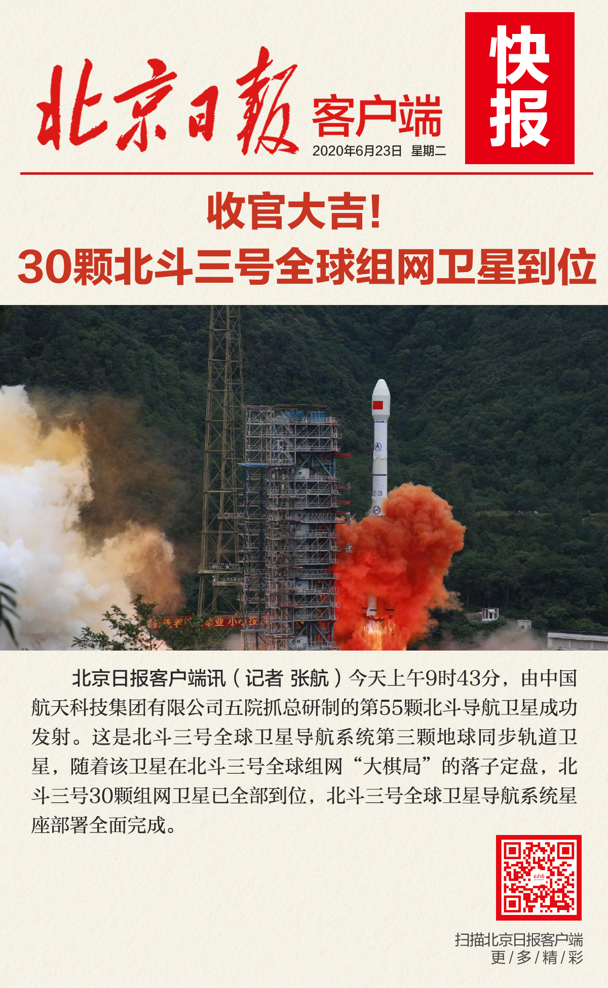 今天9点43分,由中国航天科技集团有限公司五院抓总研制的第55颗北斗导航卫星成功发射。这是北斗三号全球卫星导航系统第三颗地球同步轨道卫星,随着该卫星在北斗三号全球组网“大棋局”的落子定盘,北斗三号30颗组网卫星已全部到位,北斗三号全球卫星导航系统星座部署全面完成。
