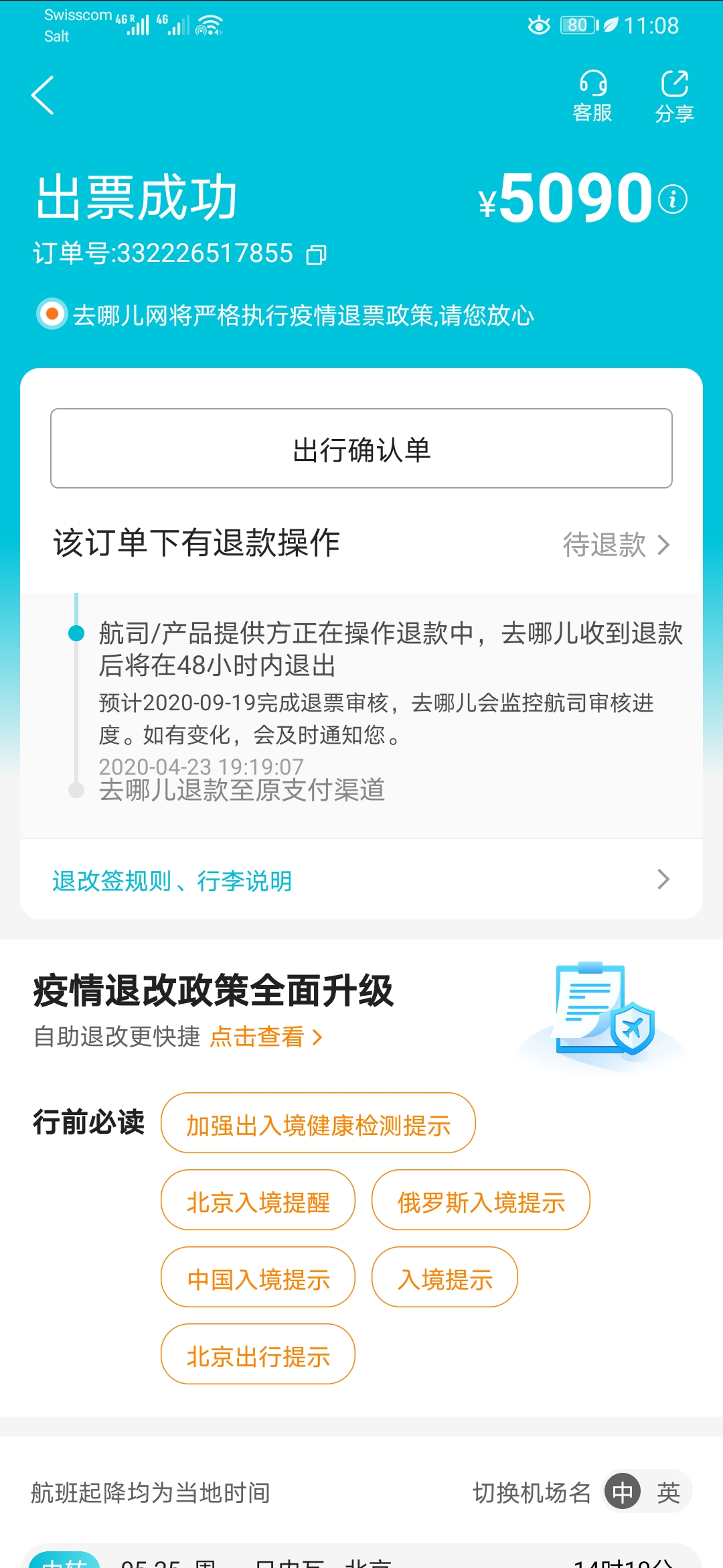 4月初,熊女士在去哪儿网预订了两张俄罗斯航空公司瑞士飞北京的机票。航班受疫情影响停飞后,熊女士4月22日就提交了退票申请,却至今都没收到票款,审核的日程甚至被延到了150天。对此,去哪儿网回应称自己也很无奈,目前GDS(全球机票分销系统)和航空公司回复的退票审核状态均为“等待审核”。“期间我们多次询问航空公司具体的审核和退票时间,均未得到明确答复。”去哪儿网表示,目前公司正在全力为用户追讨机票款。