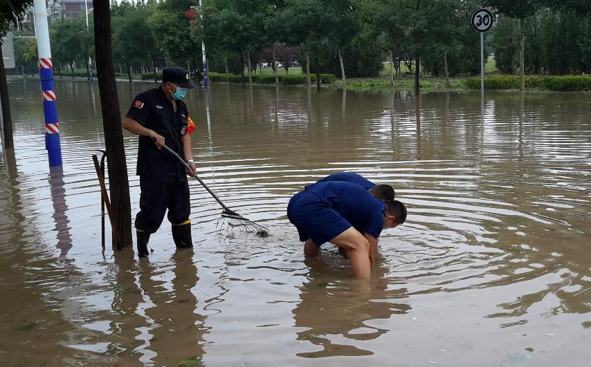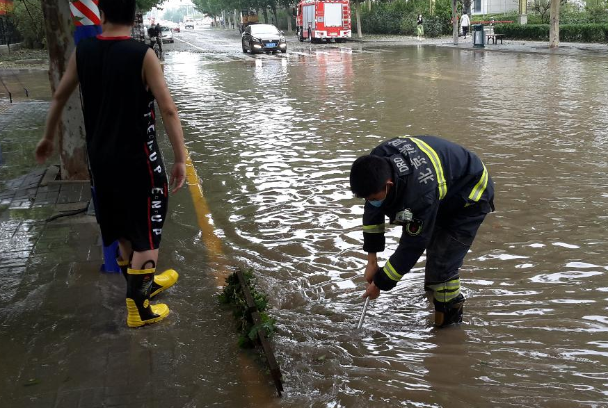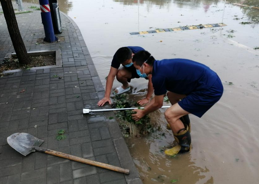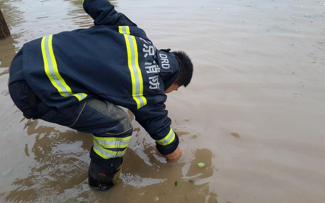 今天上午,北京魏善庄镇卫生院门前道路,因昨天暴雨导致积水严重。因为水中杂物较多,无法使用手抬泵,消防员徒手清理杂物,一小时后排空道路积水。