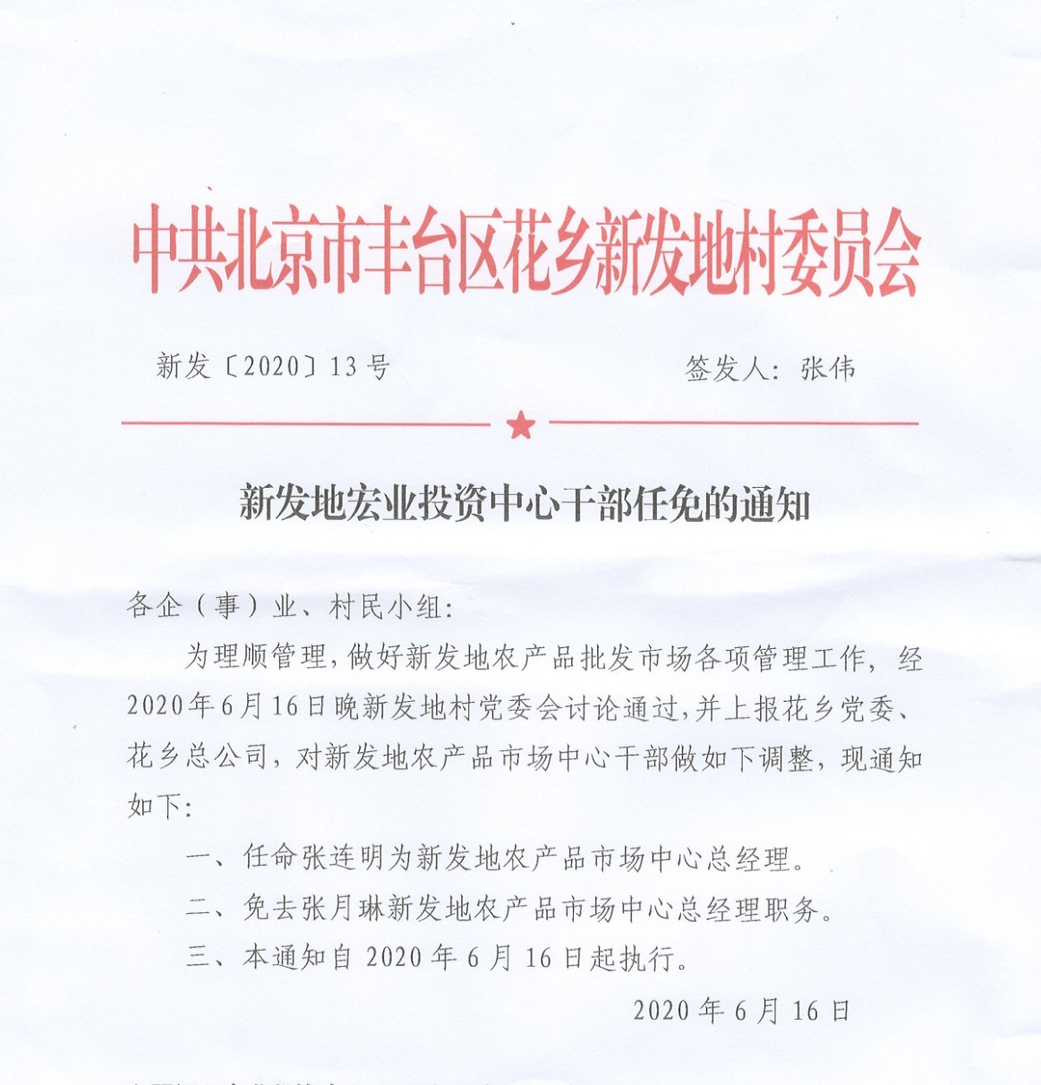 通知说,为理顺管理,做好新发地农产品批发市场各项管理工作,经2020年6月16日晚新发地村党委会讨论通过,并上报花乡党委、花乡总公司,对新发地农产品市场中心干部做如下调整,现通知如下: