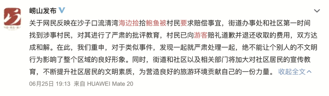 6月25日晚,青岛市崂山区人民政府新闻办公室官方微博“崂山发布”公告称:关于网民反映在沙子口流清湾海边捡拾鲍鱼被村民要求赔偿事宜,街道办事处和社区第一时间找到涉事村民,进行了批评教育,村民已向游客赔礼道歉并退还收回的费用,双方达成和解。
