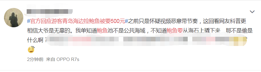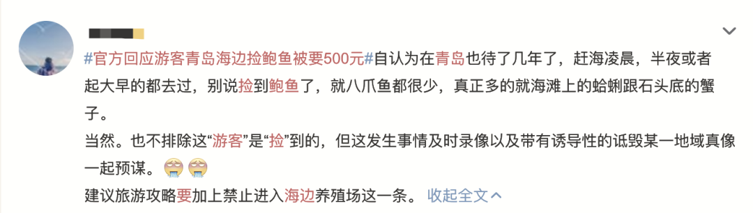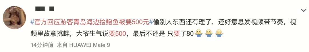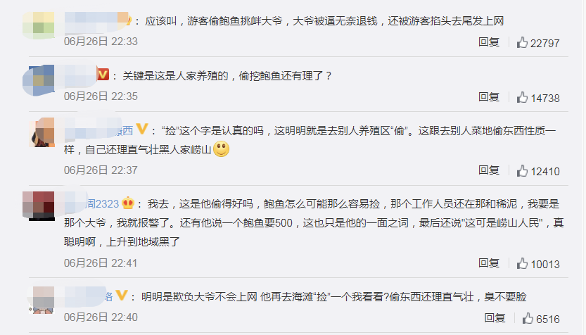 还有网友纠正媒体“带节奏”,“‘捡’这个字是认真的吗,这明明就是去别人养殖区‘偷’。这跟去别人菜地偷东西性质一样,自己还理直气壮黑人家崂山。”