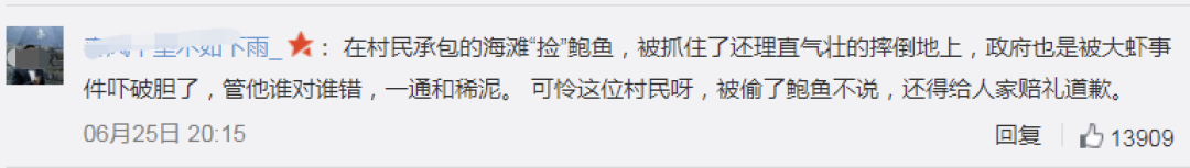 有网友表示,“在村民承包的海滩‘捡’鲍鱼,被抓住了还理直气壮地摔倒地上。政府也是被大虾事件吓破胆了,管他谁对谁错,一通和稀泥。 可怜这位村民呀,被偷了鲍鱼不说,还得给人家赔礼道歉。”