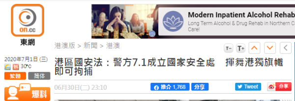 港区国安法昨日(6月30日)23时刊宪生效,特区政府发言人表示,香港警务处将于今日(7月1日)成立国家安全处,专职处理相关工作。香港“东网”等港媒援引警方消息称,香港警务人员7月1日要实时执法,若发现有人作出挥舞“港独”旗等行为,警方即可采取拘捕行动,挥舞“藏独”、“疆独”及“台独”旗亦会违法。