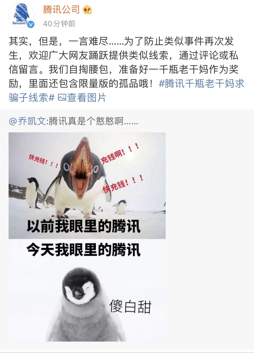 7月1日晚间,腾讯公司在官方微博回应“被骗”一事,称一言难尽,并为了防止类似事件再次发生,以1000瓶老干妈为礼品征求类似线索。