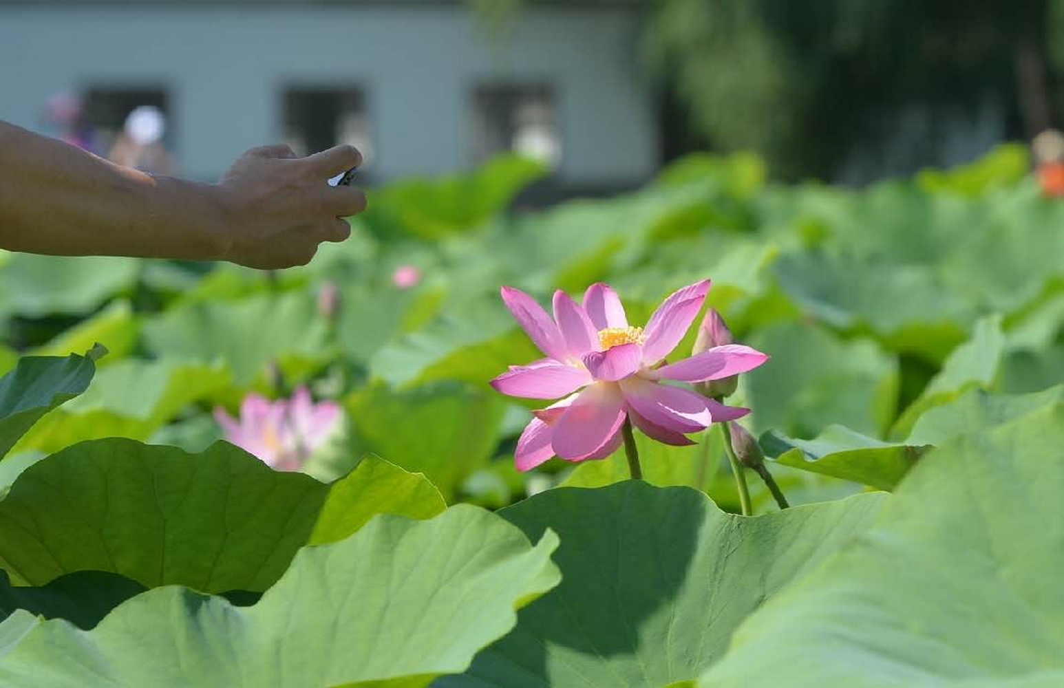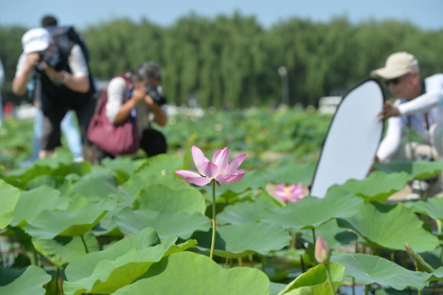 今天上午,记者来到圆明园荷花基地,正在盛开的荷花随处可见,虽然仍处于疫情防控期间,但怒放的荷花还是吸引了不少游客的前来。戴着口罩的游客们举着“长枪短炮”对准各式荷花,按下快门。