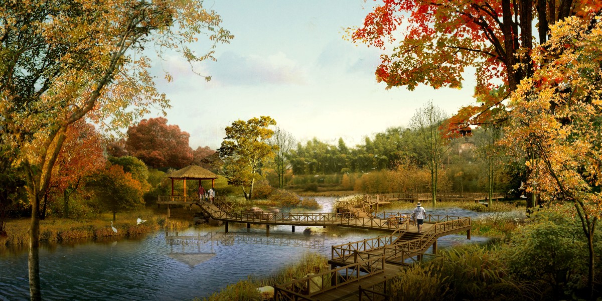 公园以湿地森林为区域核心,通过广植芦苇,形成有规模、有体量的芦苇水草湿地景观。同时种植银杏、元宝枫、栾树、黄栌等20多种彩叶植物,形成湿地景观的秋色背景。
