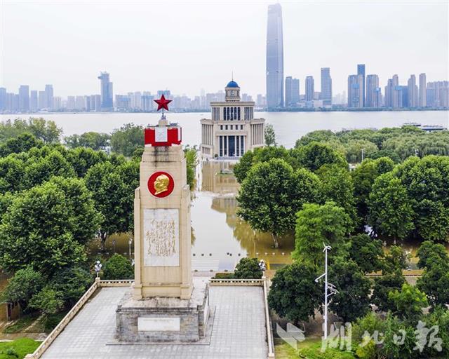 7月14日,俯瞰武汉市汉口江滩。江水已漫过最高亲水平台,武汉防汛纪念碑及武汉横渡长江博物馆静静屹立在江滩。武汉中心城区江滩公园目前已封堵通道闸口106座,其中,汉口江滩是2002年建成后第一次全面过水行洪。