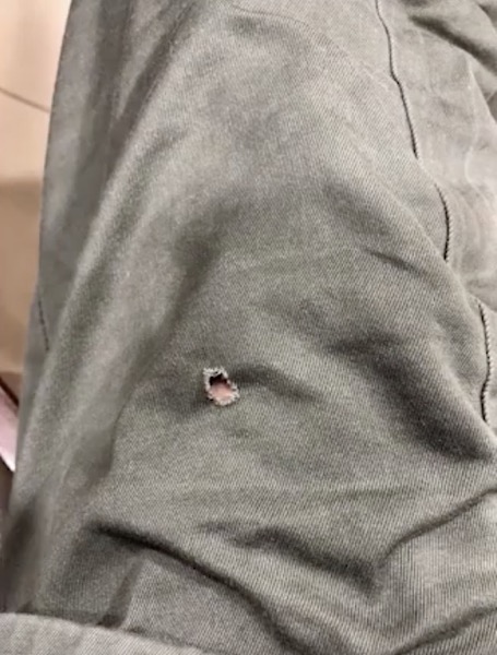 去年10月4日,大批暴徒在屯门堵路,赶去支援的阿仪又一次受伤。她称当时一名埋伏好的暴徒突然向警察扔来很多玻璃瓶,里面都装有腐蚀性液体。她不小心被液体溅中,右大腿立马有火烧的感觉,低头才发现裤子已被灼穿了一个洞。她连忙划开裤子用水冲,才发现皮肤也红了一大片。