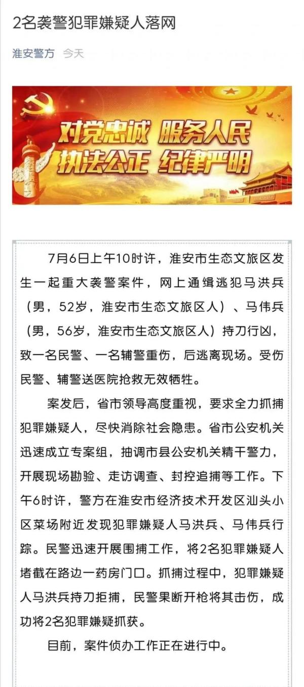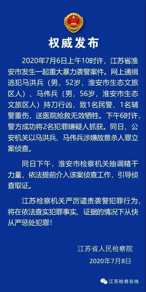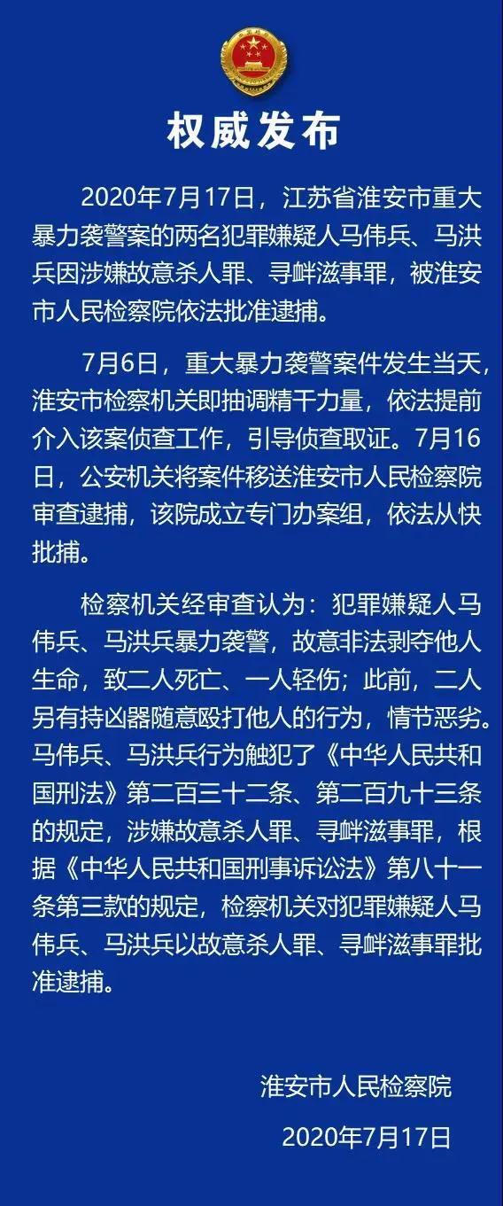 2020年7月17日,江苏省淮安市重大暴力袭警案的两名犯罪嫌疑人马伟兵、马洪兵因涉嫌故意杀人罪、寻衅滋事罪,被淮安市人民检察院依法批准逮捕。