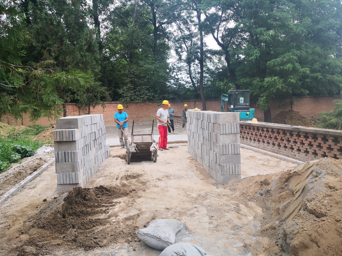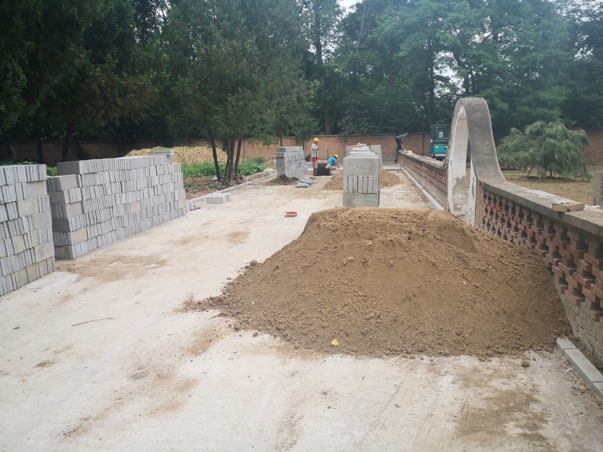 记者看到,约1500平方米的施工现场共有8名工人。在土方和砖堆间,大型机械正在进行作业。项目经理解建辉说,陵园主路将全部铺上透水砖。该主路长约56米,宽7米,现为土路。