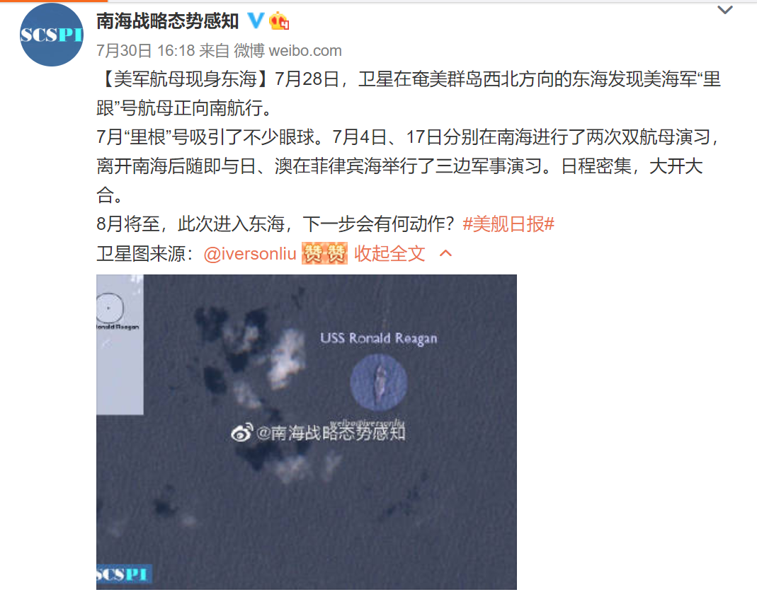 8月8日美国海军“里根”号航母战斗群现身东海开展行动。同一天,美国海军的一架P-8A反潜巡逻机现身台湾南部海域。