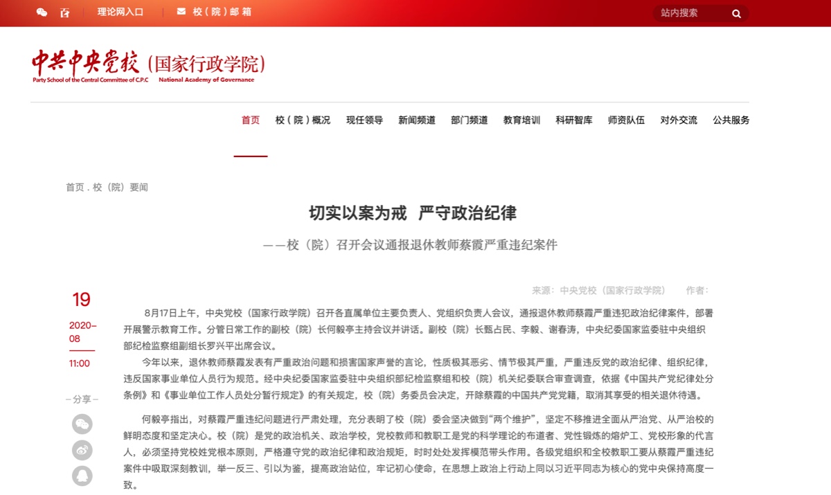 今年以来,中央党校(国家行政学院)退休教师蔡霞发表有严重政治问题和损害国家声誉的言论,性质极其恶劣、情节极其严重,严重违反党的政治纪律、组织纪律,违反国家事业单位人员行为规范。