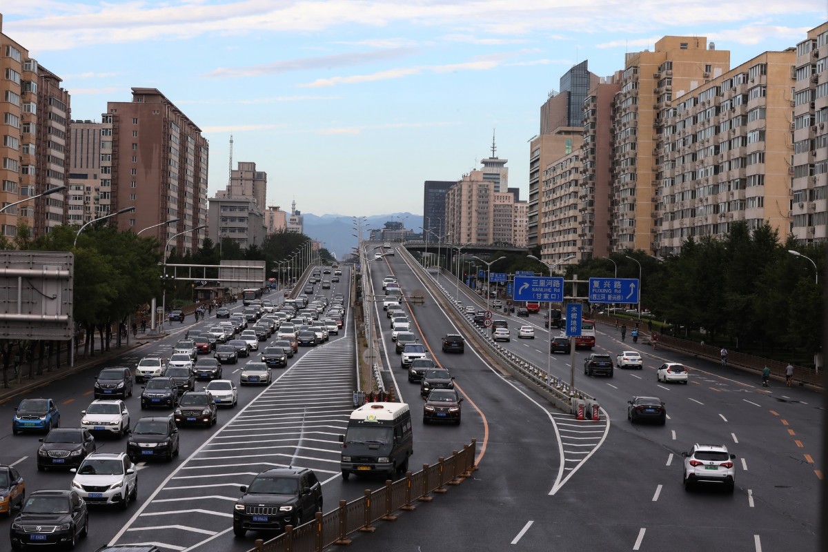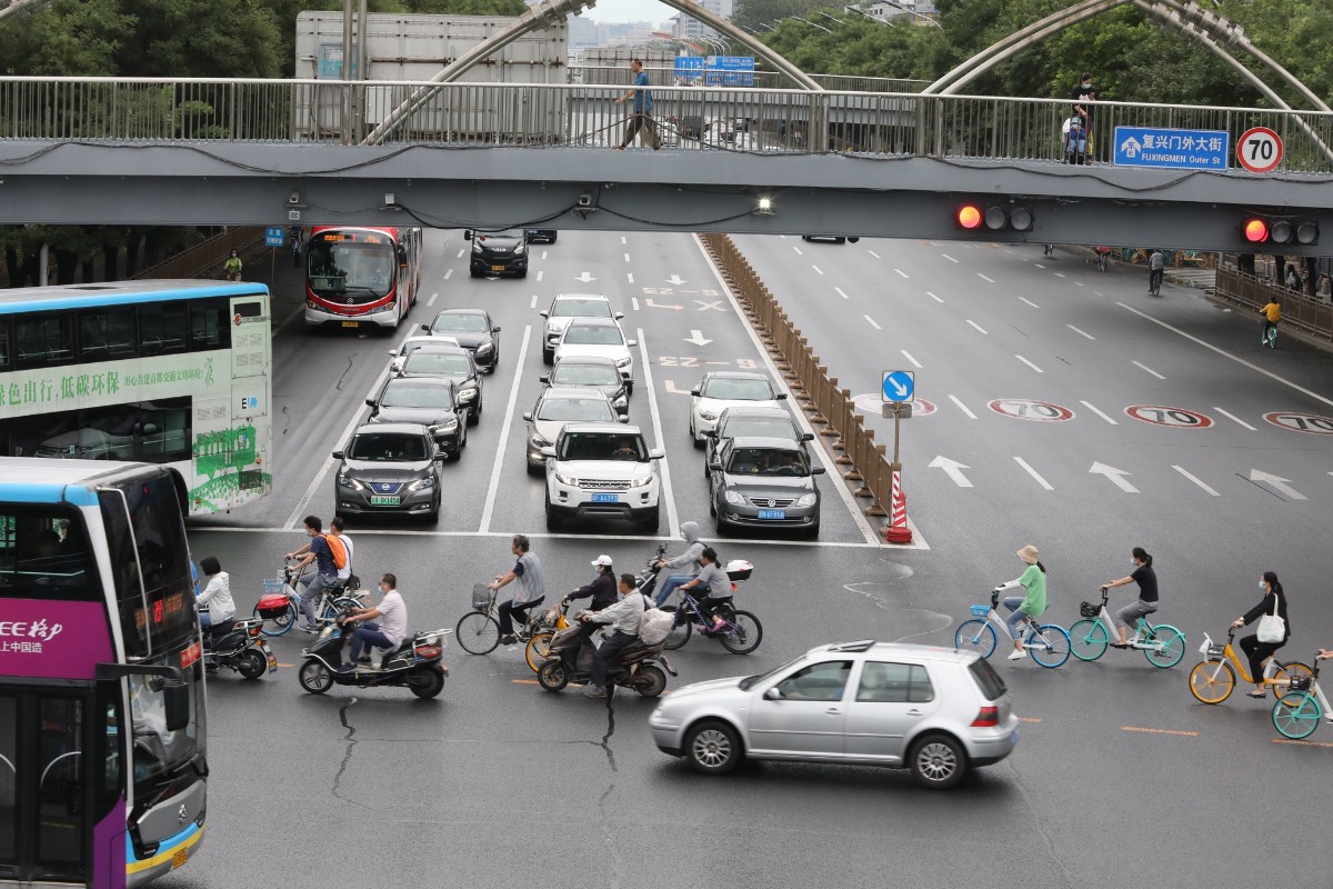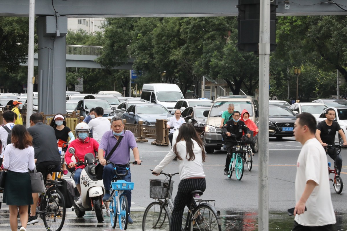 8月24日八时,雨云带基本离开北京上空,降雨基本停止。虽然道路略显湿滑,但驾车出行的市民们严守交通规则,安全行驶,交管、环卫等部门人员坚守岗位,大家共同努力,使周一的早高峰平稳有序。在复兴门外大街与白云路交叉口,车辆行人井然有序。