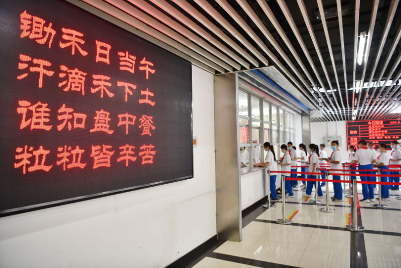 取完餐,学生们端着餐盘走到餐桌前,间隔1米同向就坐。每人餐盘里菜品数量各有不同。以主食为例,有些学生盛了米饭还领了一个小馒头,有些学生则只盛了半碗米饭。一位学生说:“以前吃盒饭,饭量小的同学剩得多,饭量大的又不够吃,现在按需盛饭,更节约更环保。开学前老师还特别嘱咐我们要自备餐具,拒绝在校园里使用一次性筷子。”
