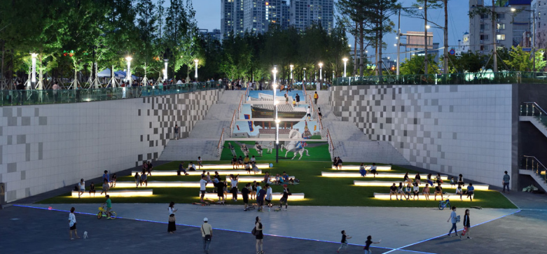 园区北侧设置有下沉广场,使首层的绿色空间延伸至地下一层,打造出低密度、高品质、绿色、开放的花园式现代科技园。