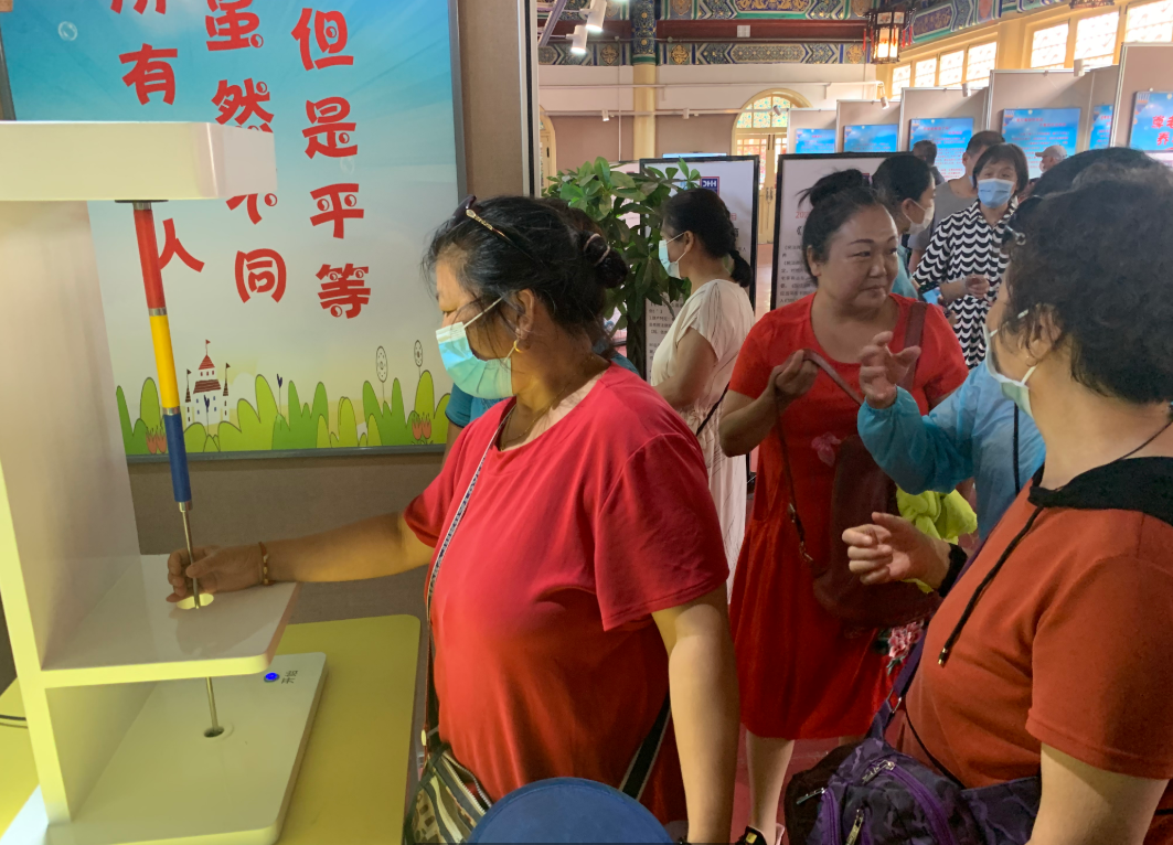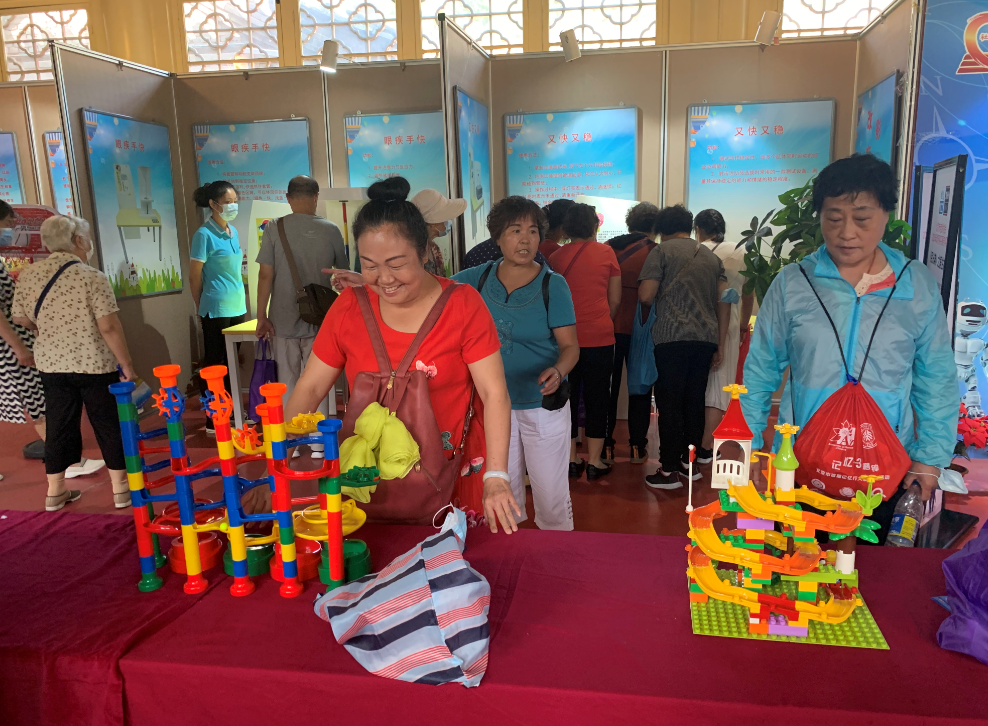而在另一个名为又快又稳的游戏里,体验者需要拿着一只带有圆环的小棍儿,顺着圆环内的管道移动,在移动过程中,金属圆环一旦触碰到管道,就会发出警报声。“人上了岁数,手容易抖,可以通过做这样的小练习,来进行锻炼。”
