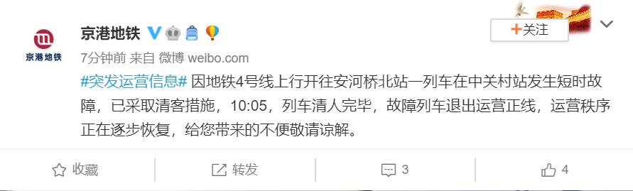 上午10时30分,京港地铁官方微博发布消息称:地铁4号线上行开往安河桥北站一趟列车在中关村站发生短时故障,已采取清客措施,10时05分,列车清客完毕,故障列车退出运营正线,运营秩序逐步恢复。