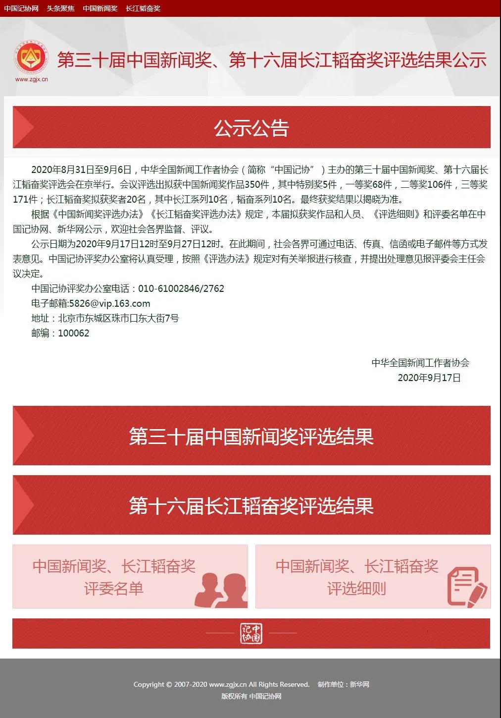 自9月17日起,中国记协在中国记协网、新华网公示第三十届中国新闻奖、第十六届长江韬奋奖评选结果。本届中国新闻奖共评选出350件拟获奖作品,其中特别奖5件,一等奖68件,二等奖106件,三等奖171件;评选出长江韬奋奖拟获奖者20名,其中长江系列10名,韬奋系列10名。最终获奖结果以揭晓为准。同时公示的还有本届《评选细则》和评委名单。