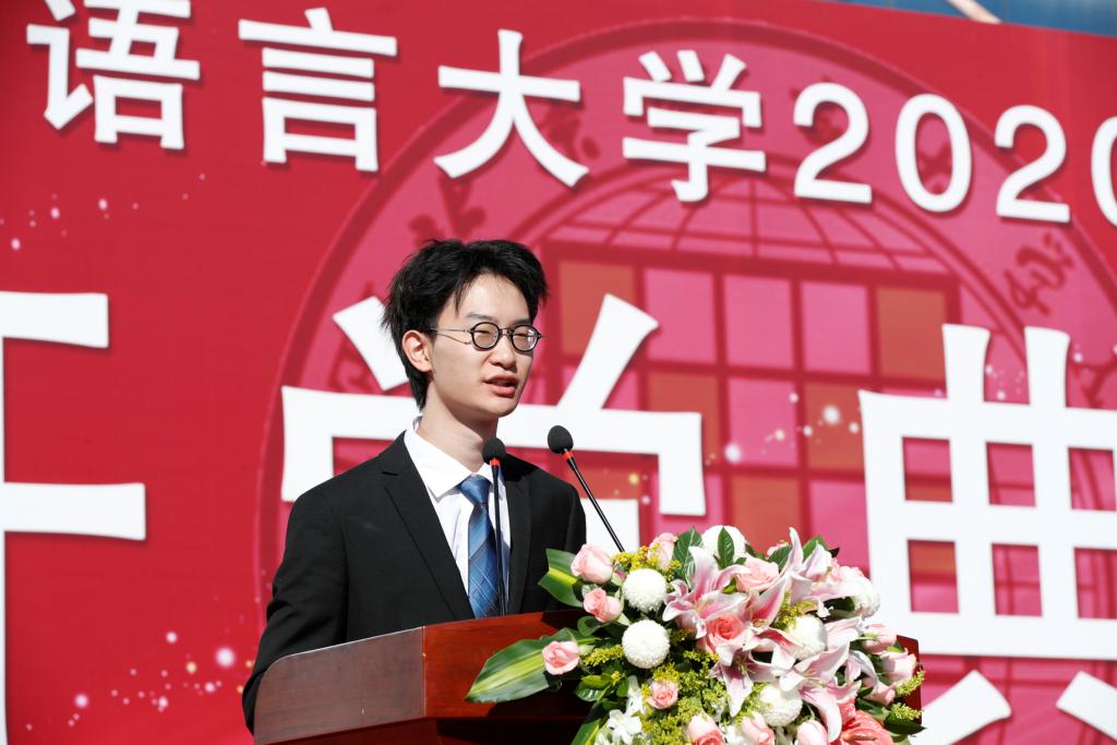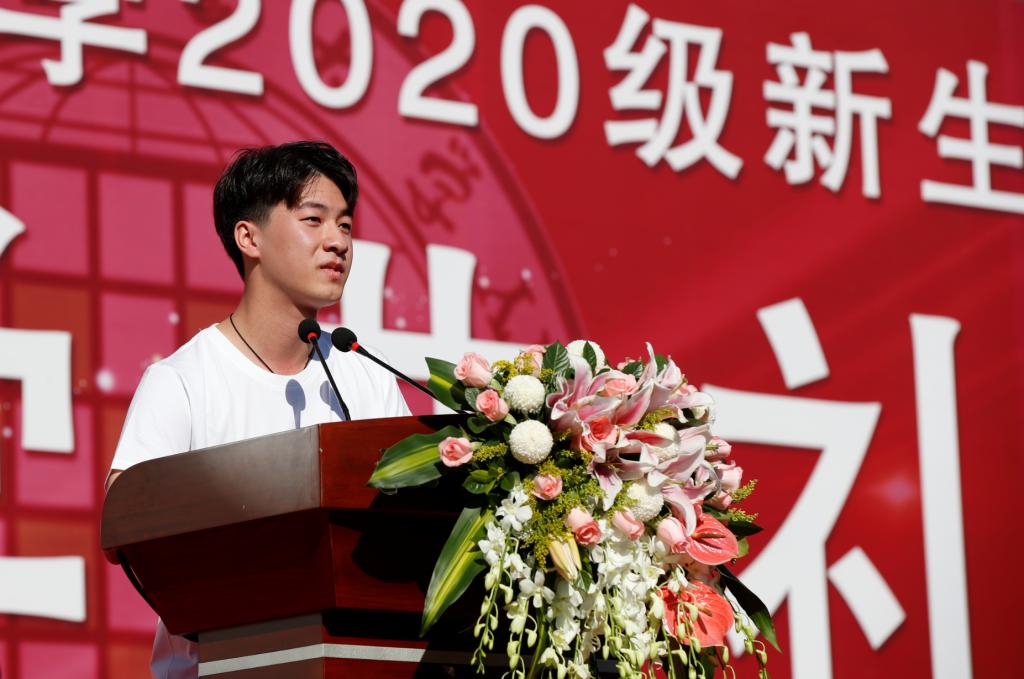 三名新生代表和两名老生代表依次上台发言,他们既讲述了自己的故事也分享了对未来的期待。“我们一起经历了疫情的挑战与高考的洗礼,我第一次如此真切的感受到个人命运与国家命运的统一。无数动人的片段给我带来了感动与鼓励,成为我疫情备考期间的珍贵回忆。”来自湖北武汉、人文社会科学学部2020级汉语国际教育专业本科生肖贝勒同学是国内抗击新冠疫情最早的亲历者和见证者,他希望以北语为家,以共同理想为帆,以“德行言语,敦睦天下”为训,磨练自我,砥砺前行。