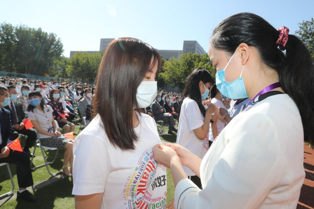 开学典礼上,辅导员代表为新生代表佩戴校徽,标志着各位同学成为一名真正的北语人,成为北语“小联合国”这个大家庭中的一员。2781名宝贝鱼汇聚在北语这片充满激情和梦想的沃土,树立远大目标,持之以恒地坚持修德、勤学、笃行,努力成为为实现中华民族伟大复兴的中国梦而不懈奋斗的当代青年,成为中外文化交流的友好使者、人类命运共同体的建设者。开学典礼在全体师生共同高唱校歌声中圆满结束。