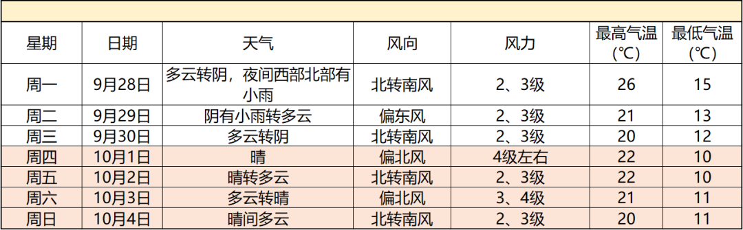 下周中后期受冷空气影响,天气以晴到多云为主,白天最高气温在22℃左右,夜间最低气温只有10-12℃,深秋步步逼近,多多关注天气变化,适时增添衣物。