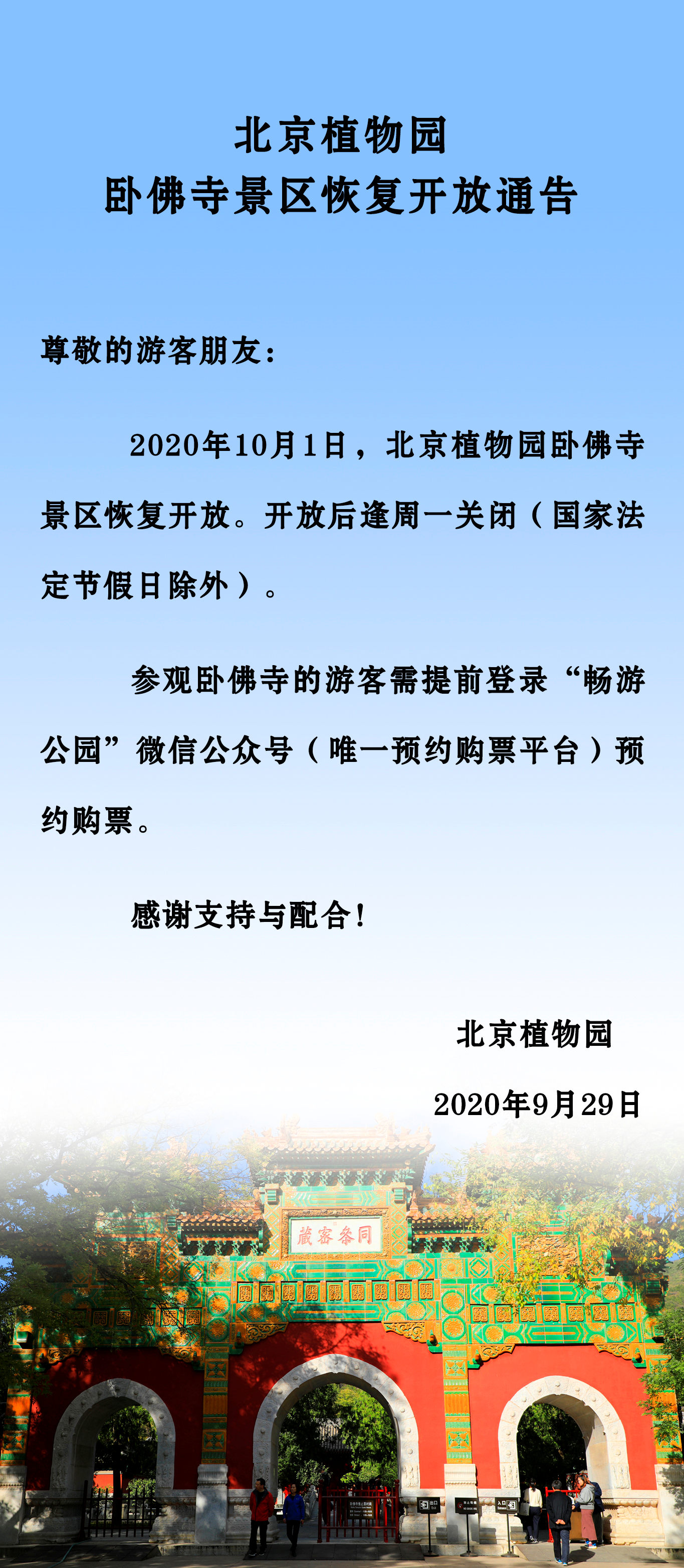 9月29日下午,北京植物园发布通告,从10月1日开始,北京植物园卧佛寺景区恢复开放。开放后逢周一关闭(国家法定节假日除外)。