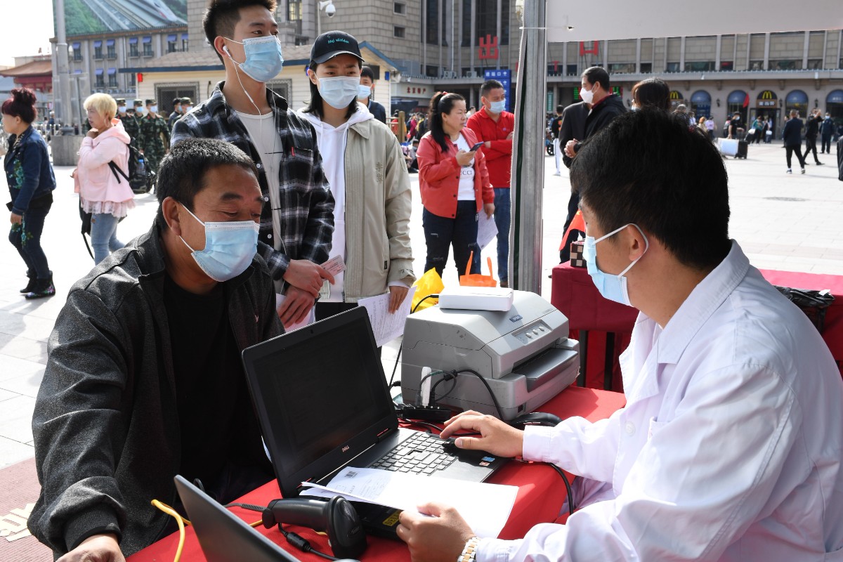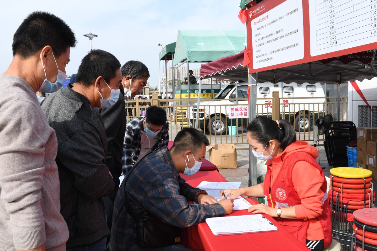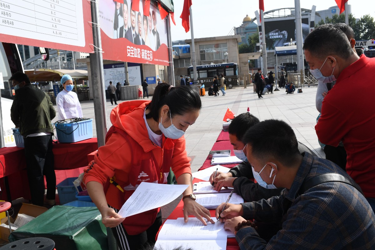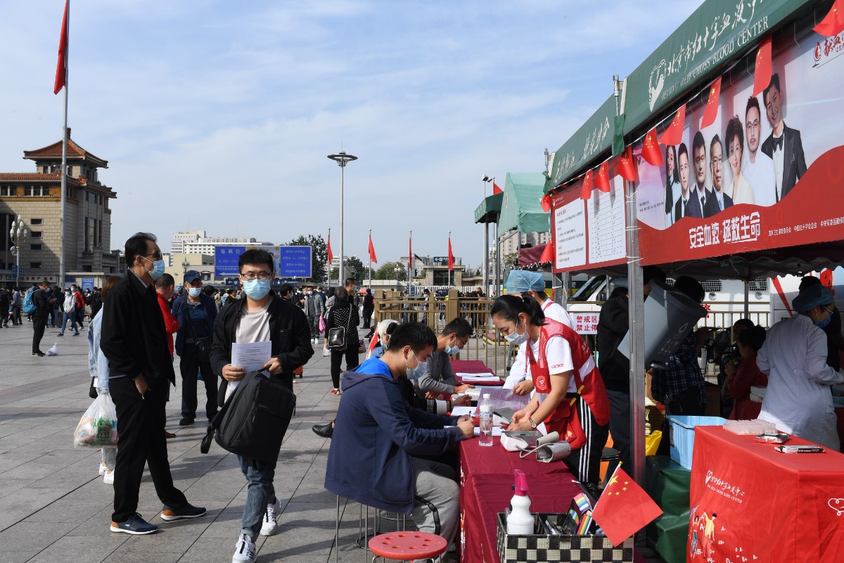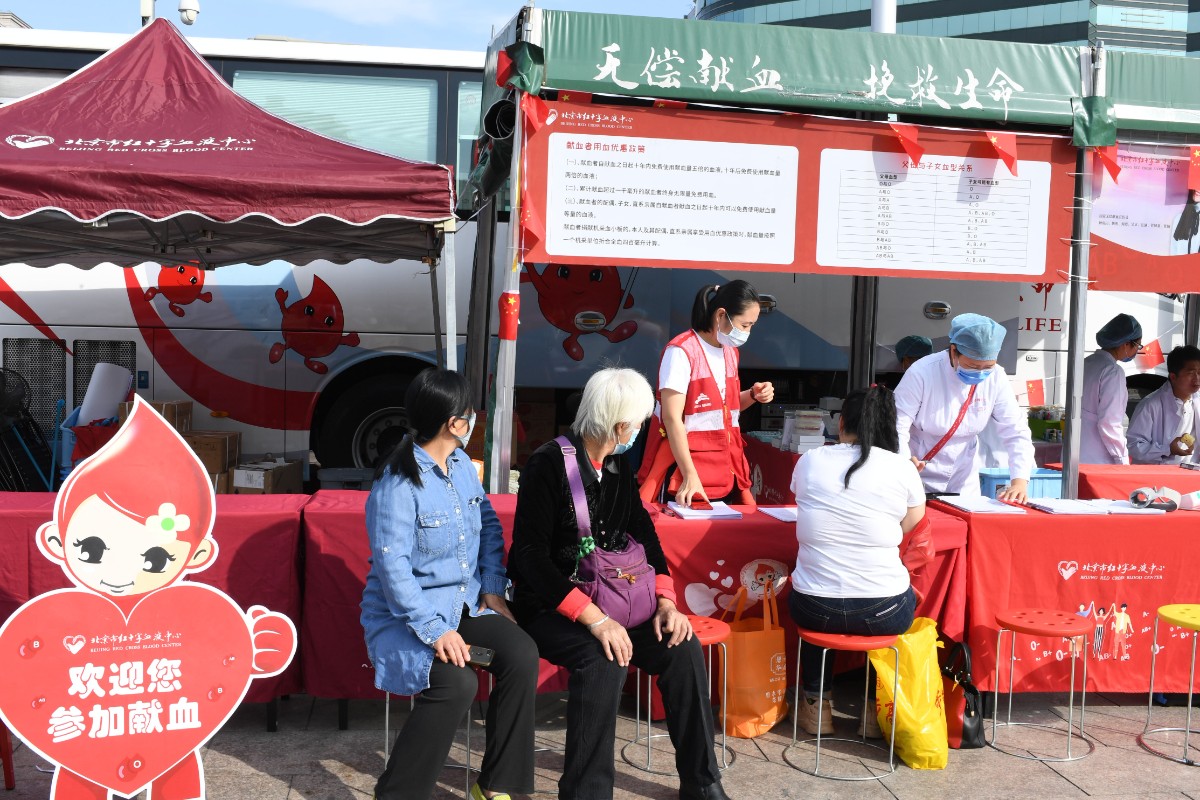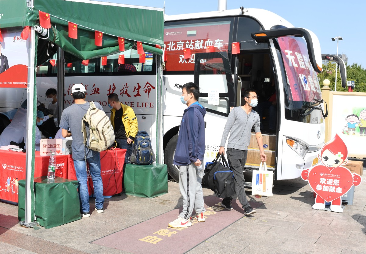 “请您佩戴口罩,清洁双手,保持1米间距……” 10月3日是国庆假期的第三天,上午9点多,在位于北京站广场中央旗杆东侧的献血点,等候献血的爱心人士早早就排起了长队。