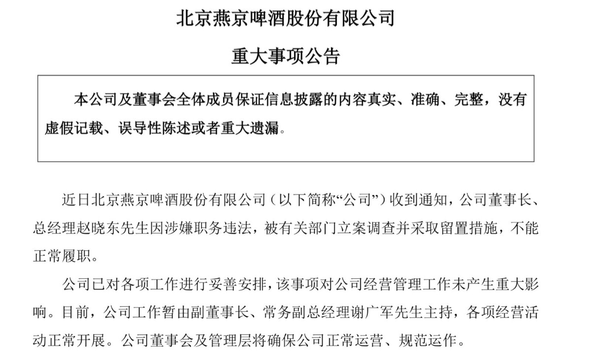 燕京啤酒在公告中表示,公司已对各项工作进行妥善安排,该事项对公司经营管理工作未产生重大影响。目前,公司工作暂由副董事长、常务副总经理谢广军先生主持,各项经营活动正常开展。公司董事会及管理层将确保公司正常运营、规范运作。除此事项外,公司无其他应披露未披露信息。