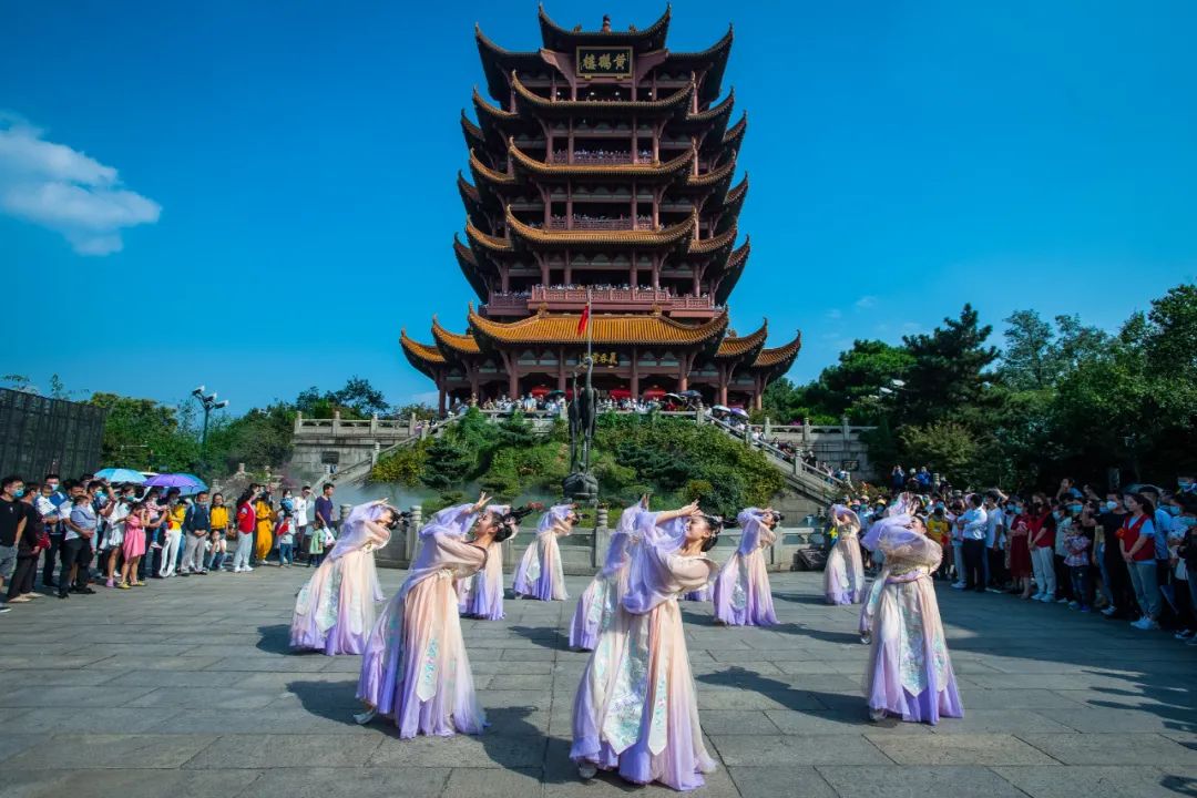 游客在湖北武汉黄鹤楼景区观看演出(10月1日摄)。新华社记者 肖艺九 摄