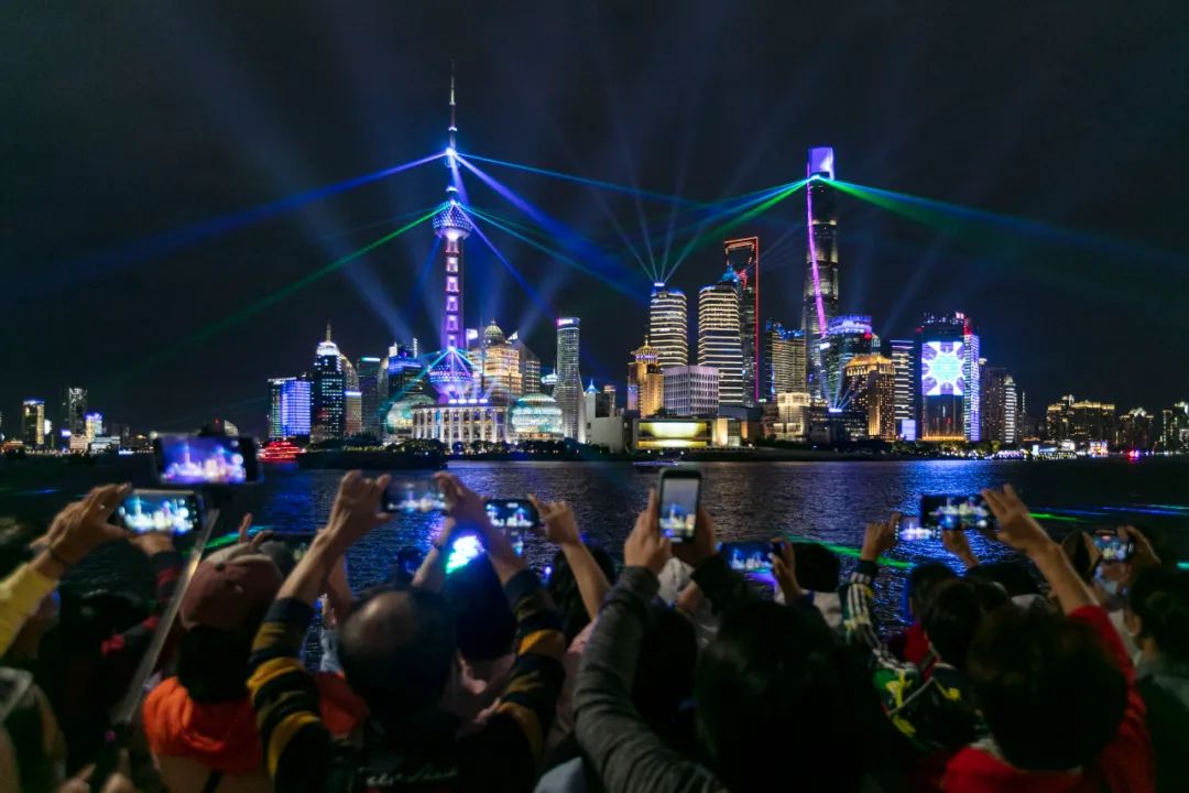 10月5日,人们在上海外滩观赏灯光秀。新华社记者 王翔 摄