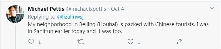 居住在北京的网友迈克尔·佩蒂斯说,自己住在北京后海附近,近日挤满了游客,去三里屯发现那里也全是游客。