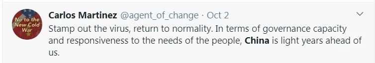 网友卡洛斯·马丁内斯说,打败病毒,回到正常,在政府治理能力和对民众诉求回应速度方面,“中国比我们领先好多光年”。
