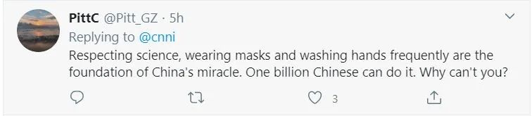 网友PittC说,尊重科学,戴口罩,常洗手,这些都是今日中国奇迹的基础。“(超过)十亿中国人都能做到,你为什么不行?”