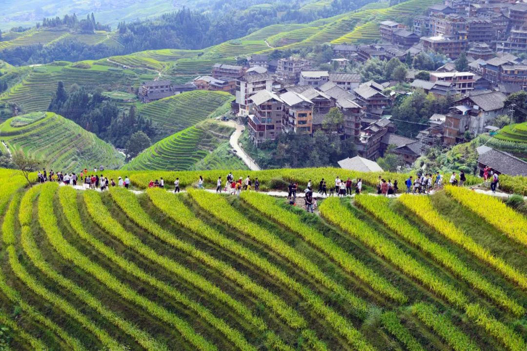 10月3日,游客在广西龙胜各族自治县龙脊梯田景区观光游玩。新华社发(吴生斌 摄)