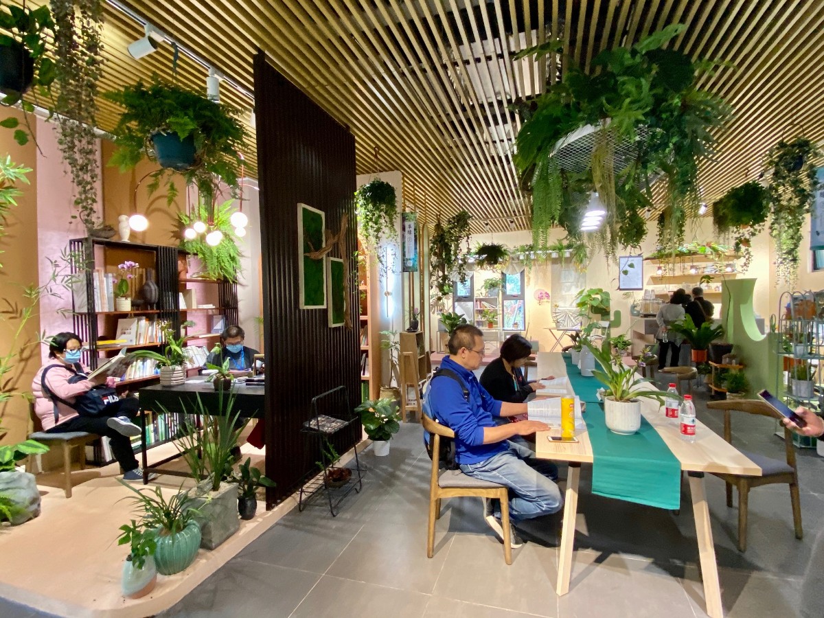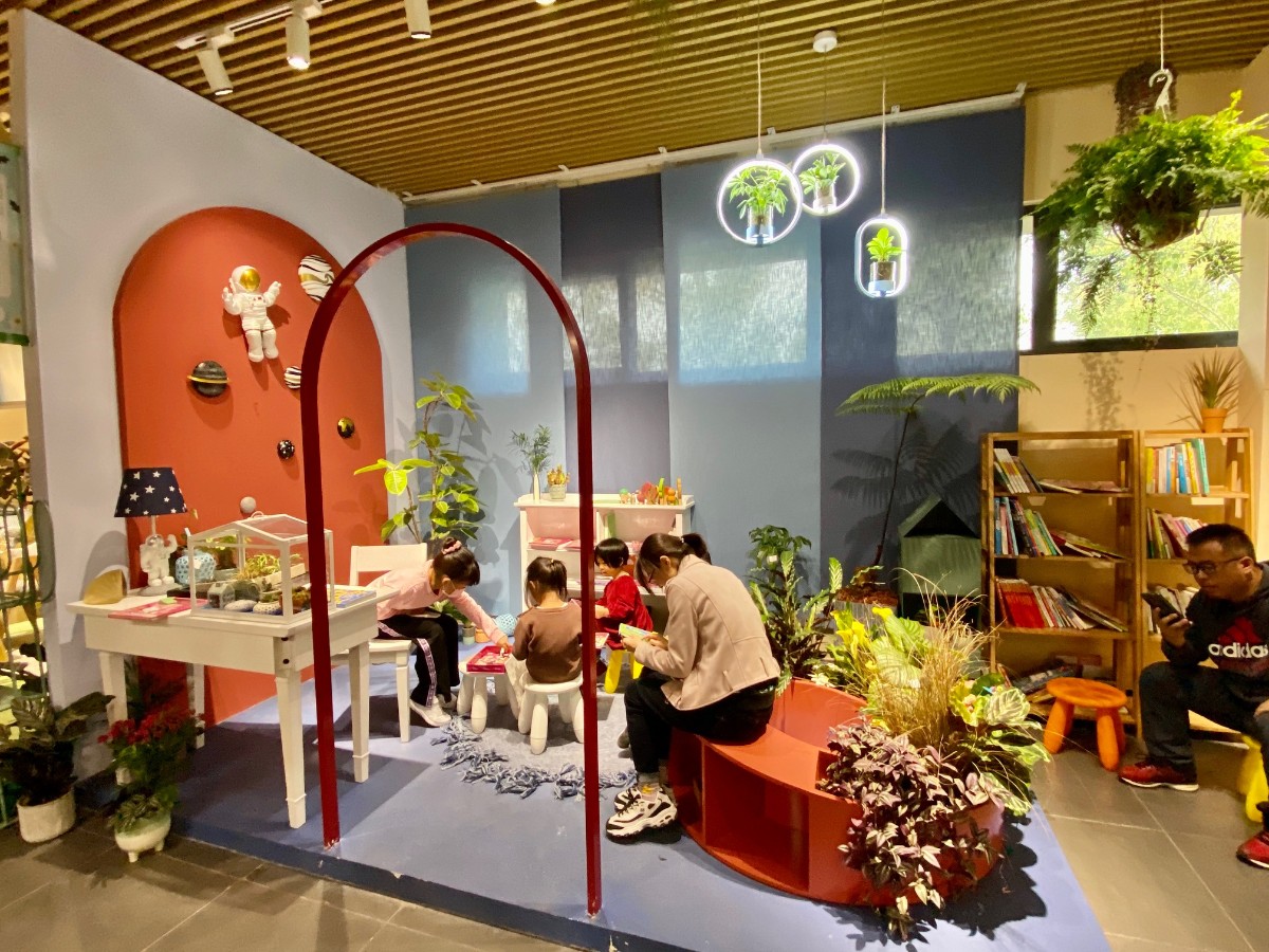 园艺驿站和森林书屋相邻,是供游客阅读、品茶的场所,设有绿心植物沙盘、森林悦读区、亲子互动区、园艺体验区、餐饮服务区等。有游客一进门就被这里的氛围吸引住了。从书架上挑上一两本书,再点上一杯茶或者咖啡,安安静静一坐就是一下午。孩子们有看绘本的,有在工作人员指导下做多肉盆栽的,做植物手工的,各得其乐。