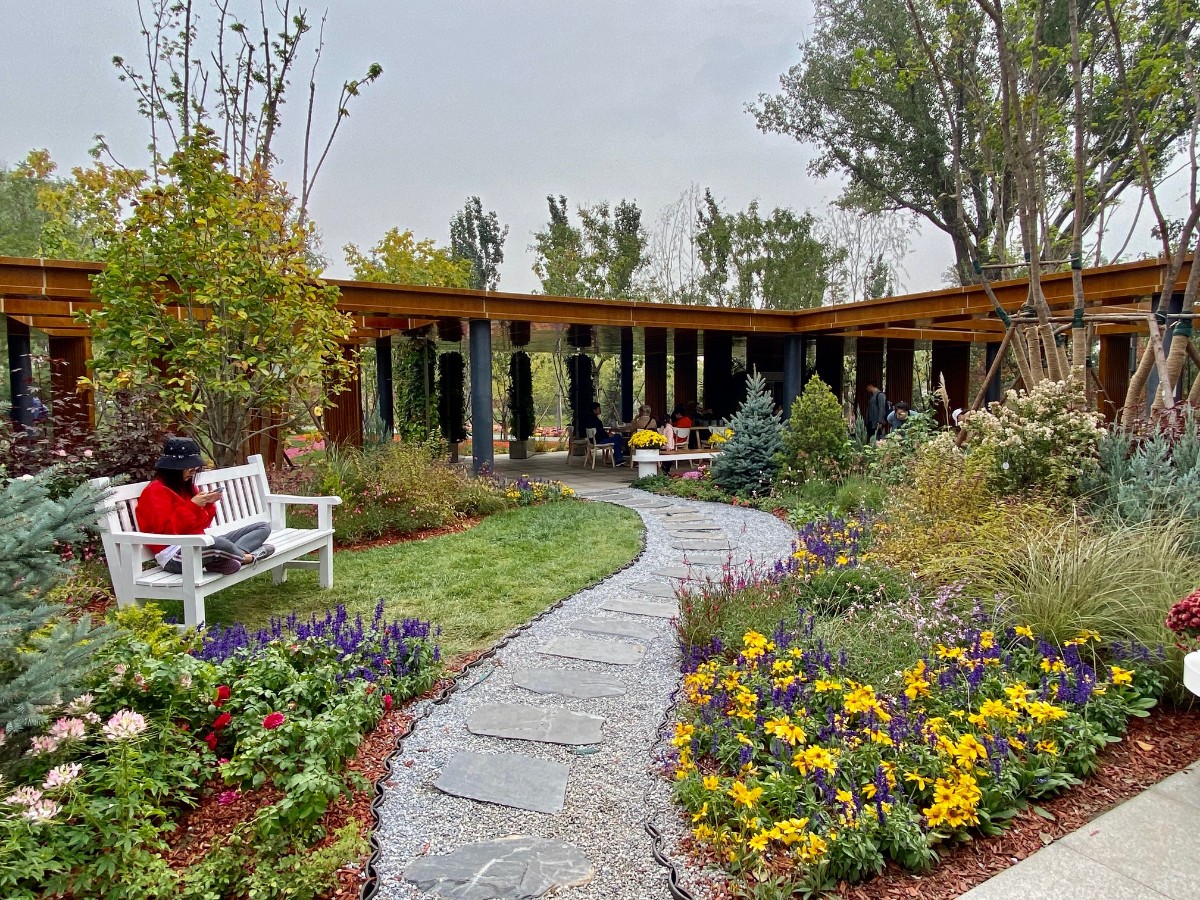 以“森林让生活更美好”为主题,室内室外均进行了沉浸式、体验式的园艺布置。由青灰色建筑和木质休闲长廊围合而成的庭院内,青石板路蜿蜒而过,各色鲜花绿植像锦锻一样铺满了大半个庭院。绿草地,白色的休闲座椅,优雅悦目的庭院设计,让初来乍到的游客赞叹不已。