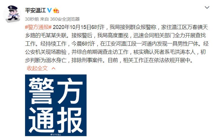10月16日下午,四川成都温江警方通报,2020年10月15日6时许,我局接到群众报警称,家住温江区万春镇天乡路的毛某某失联。接报警后,我局高度重视,迅速会同相关部门全力开展查找工作。