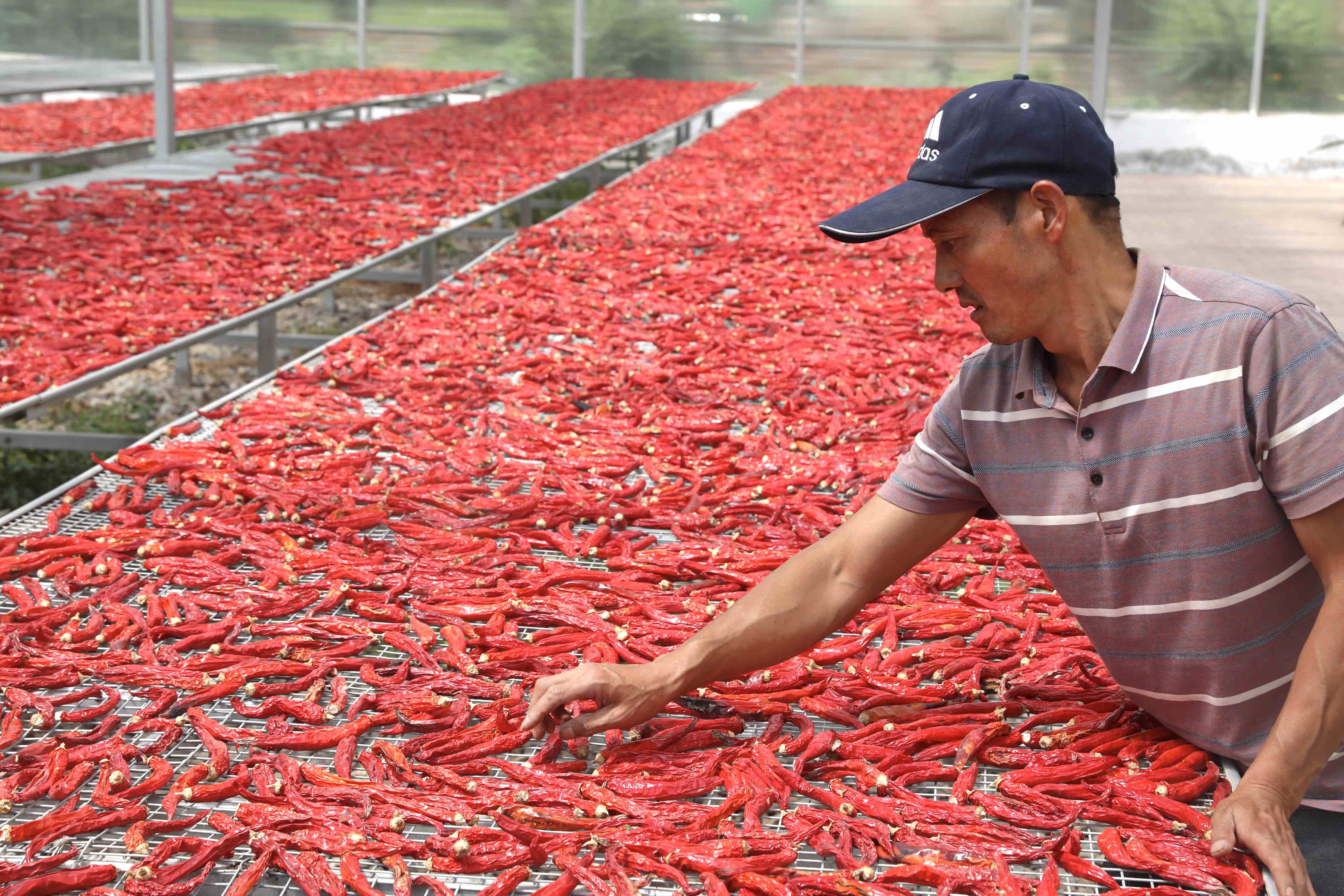△甘肃省陇南市西和县,地处秦巴山区,是全国52个未摘帽贫困县之一。近年来,西和县因地制宜构建产业体系,向最后的贫困堡垒发起总攻。图为2020年9月4日,西和县理红种植养殖农民专业合作社的辣椒种植基地里,社员在晾晒新一茬的红辣椒。