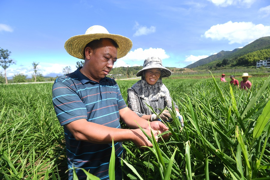 △2020年9月17日,汝城县文明瑶族乡沙洲现代农旅示范基地,农户在查看小黄姜的生长情况。
