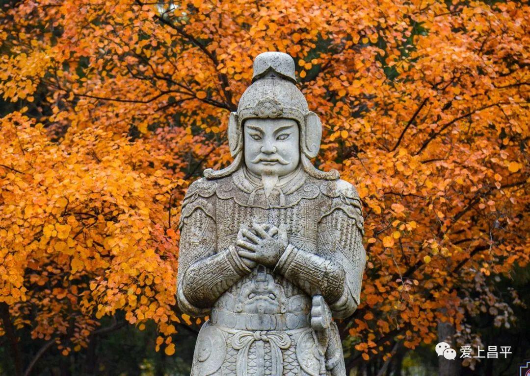 明十三陵神路,这条通向明代皇帝墓寝的神秘古道,是明十三陵的第一个景点。路旁的石像生造型生动,雕工精细,掩映在一片橙色的秋叶中。