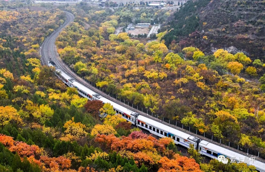 登高俯瞰,红叶漫山遍野,猩红的枫叶、深紫红色的黄栌树叶,层林尽染,美不胜收。一列南下的列车,与长城并驾齐驱。