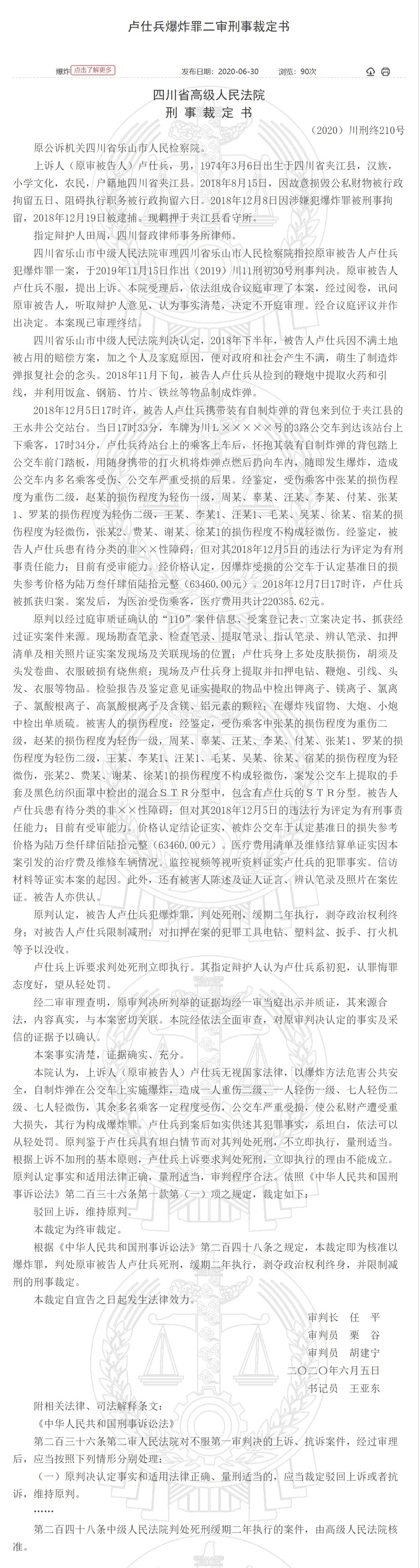 记者17日从中国裁判文书网获悉,近日,2018年四川“12.05”夹江3路公交车爆炸案犯罪二审被裁定即为核准以爆炸罪,判处原审被告人卢仕兵死刑,缓期二年执行,剥夺政治权利终身,并限制减刑的刑事裁定。