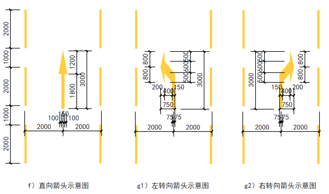 4.7转向导向箭头应根据实际的车道导向需要设置,箭头应距曲线段起点3m处设置,转向导向箭头组合使用时不宜超过2种方向。做法参见【详图)f)g1)g2)】