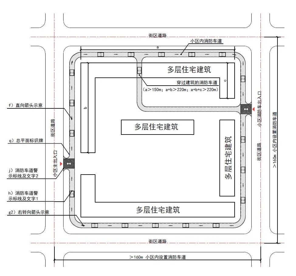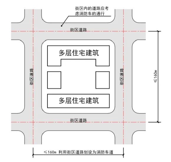 1.1针对多层住宅建筑的居民小区,以居民小区周边的街区道路作为消防车道,满足消防车道通行要求,即小区周边的街区道路中心线的距离小于160米时,即可使用街区道路作为消防车道。【图示1.1】